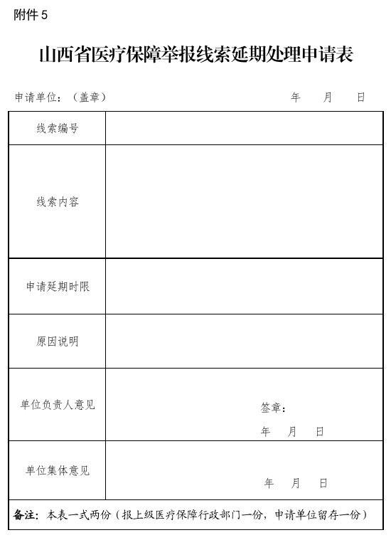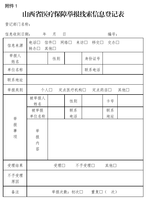 ??醫(yī)療保障行政部門對接收的舉報進行登記,及時準確填寫《山西省醫(yī)療保障舉報線索信息登記表》(附件1)。