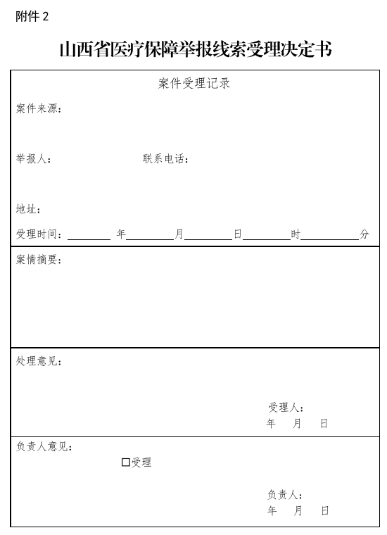 ??(一)舉報人實名舉報的,醫(yī)療保障行政部門經(jīng)核查,舉報線索中的事項屬于或者部分屬于受理范圍的,應當制作《山西省醫(yī)療保障舉報線索受理決定書》(附件2),并書面告知舉報人。