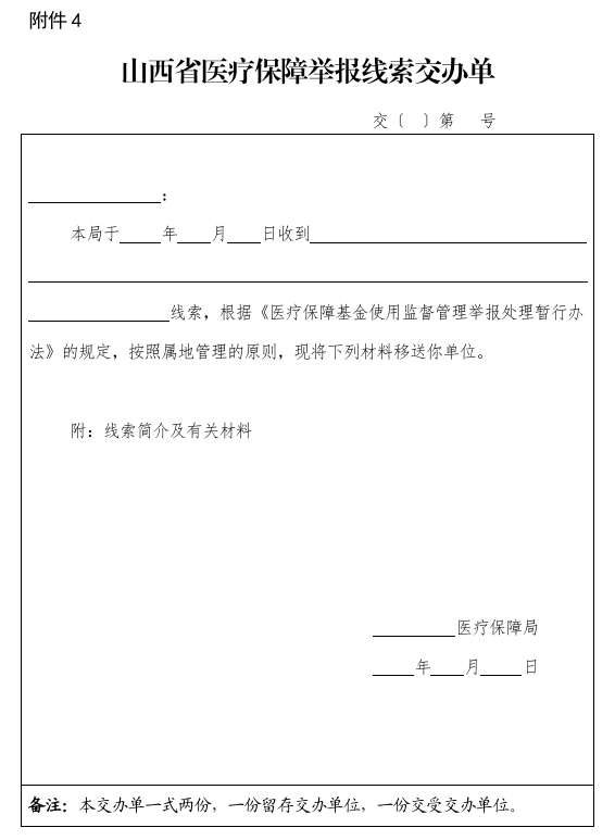 ??第十六條 上級醫(yī)療保障行政部門接收的舉報,應當按規(guī)定及時交辦有處理權限的下級醫(yī)療保障行政部門或同級醫(yī)療保障行政部門相關機構進行處理,并制作《山西省醫(yī)療保障舉報線索交辦單》(附件5)。