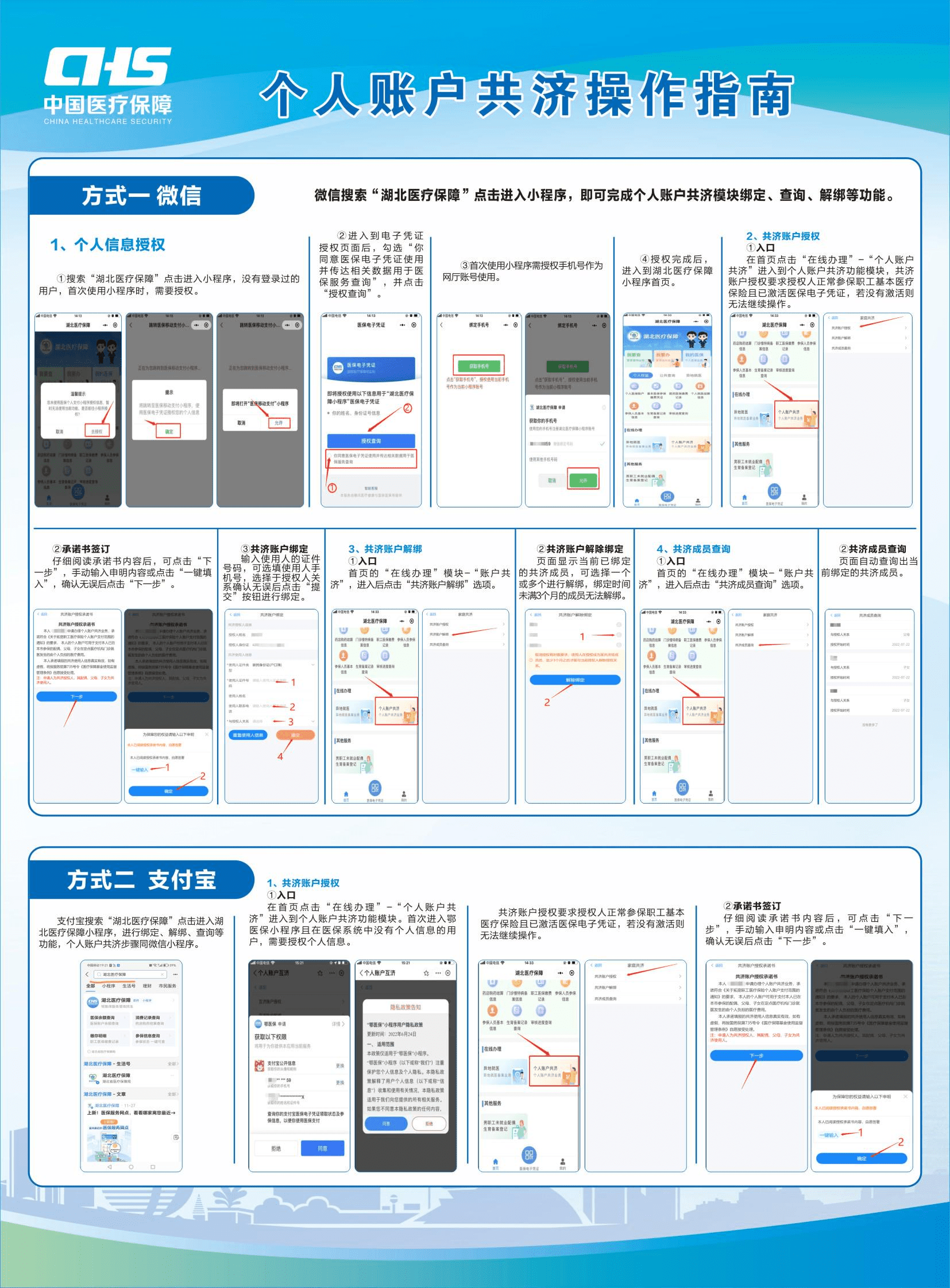 ?????? 如果本人個(gè)人賬戶有余額,還可以開通個(gè)人賬戶共濟(jì),刷本人臉后選擇業(yè)務(wù)辦理人即可完成個(gè)人賬戶共濟(jì)支付。個(gè)人賬戶共濟(jì)綁定方式見下圖: