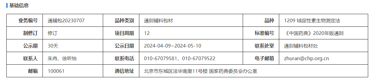 ??? 我委擬修訂1209 絨促性素生物測定法。為確保標準的科學性、合理性和適用性,現(xiàn)將擬修訂的1209 絨促性素生物測定法公示征求社會各界意見(詳見附件)。公示期自發(fā)布之日起一個月。請認真研核,若有異議,請及時在線反饋,并附相關(guān)說明、實驗數(shù)據(jù)和聯(lián)系方式。來函需打印后加蓋公章,個人來函需打印后本人簽名,并郵寄至我委通訊地址。