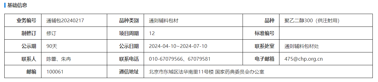 ??? 我委擬修訂聚乙二醇300(供注射用)國家藥用輔料標準。為確保標準的科學性、合理性和適用性,現(xiàn)將擬修訂的標準公示征求社會各界意見(詳見附件)。公示期自發(fā)布之日起三個月。請認真研核,若有異議,請及時在線反饋,并附相關(guān)說明、實驗數(shù)據(jù)和聯(lián)系方式。來函需打印后加蓋公章,個人來函需打印后本人簽名,并郵寄至我委通訊地址。
