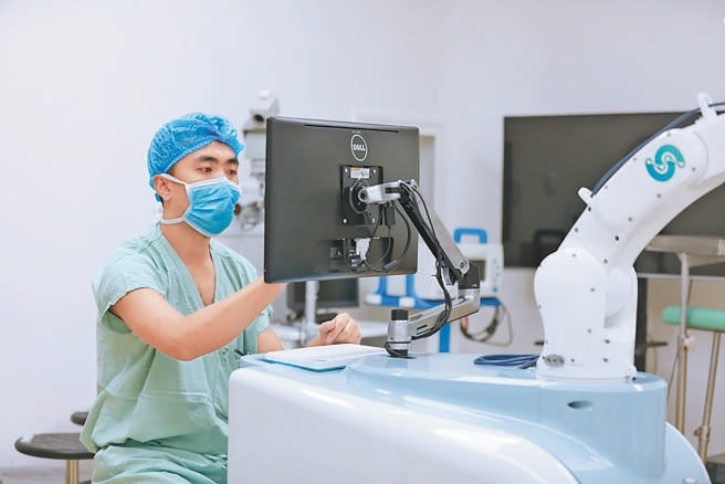 華科精準聯(lián)合創(chuàng)始人兼首席技術官劉文博正在調試手術機器人設備。 受訪者供圖